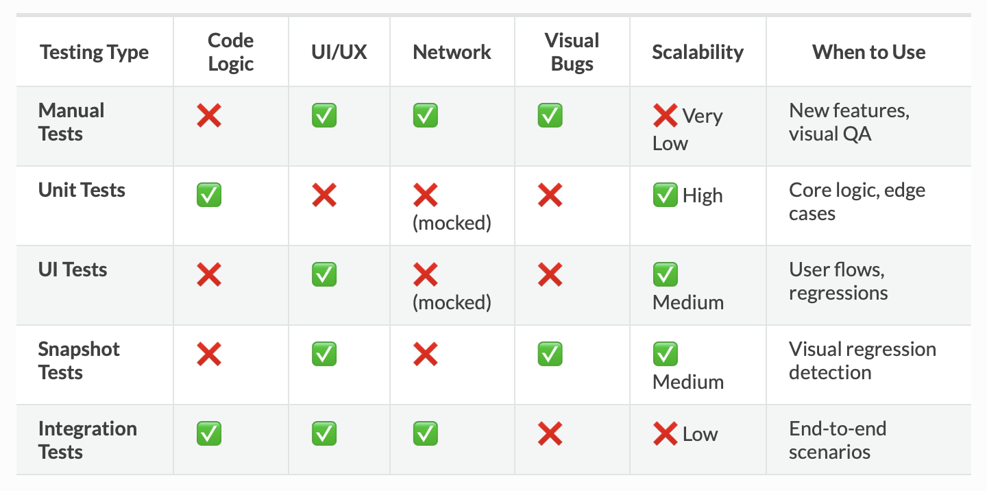 - With Snapshot tests, we can automatically catch visual regressions by comparing current UI renders against stored reference images. They excel at detecting layout changes, color shifts, and font issues that other tests miss. However, they require maintenance overhead when UI changes intentionally.
